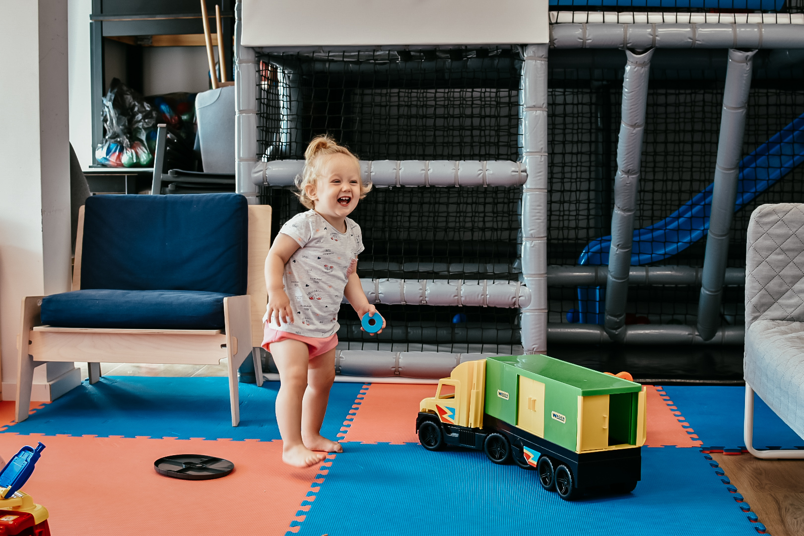 Przede wszystkim dość sporych rozmiarów pokój zabaw dla dzieci, wyposażony w małpi gaj ze zjeżdżalnią oraz sporą ilość zabawek – zarówno drewnianych, jak i interaktywnych.